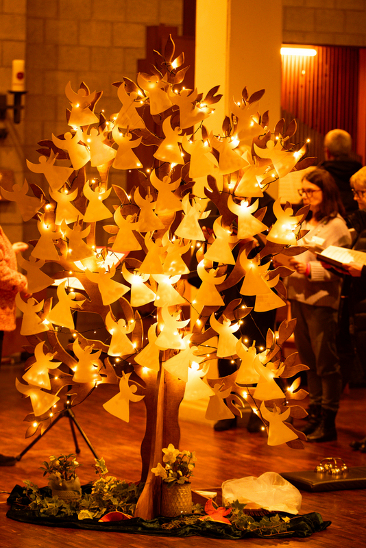 Während der Gedenkfeier wurden die mit den Namen der Verstorbenen versehenen Engel an den Gedenkbaum gehängt. Am Ende war der Baum gefüllt mit Engeln, jeder einzelne ein persönlicher Schutzengel für die Hinterbliebenen.