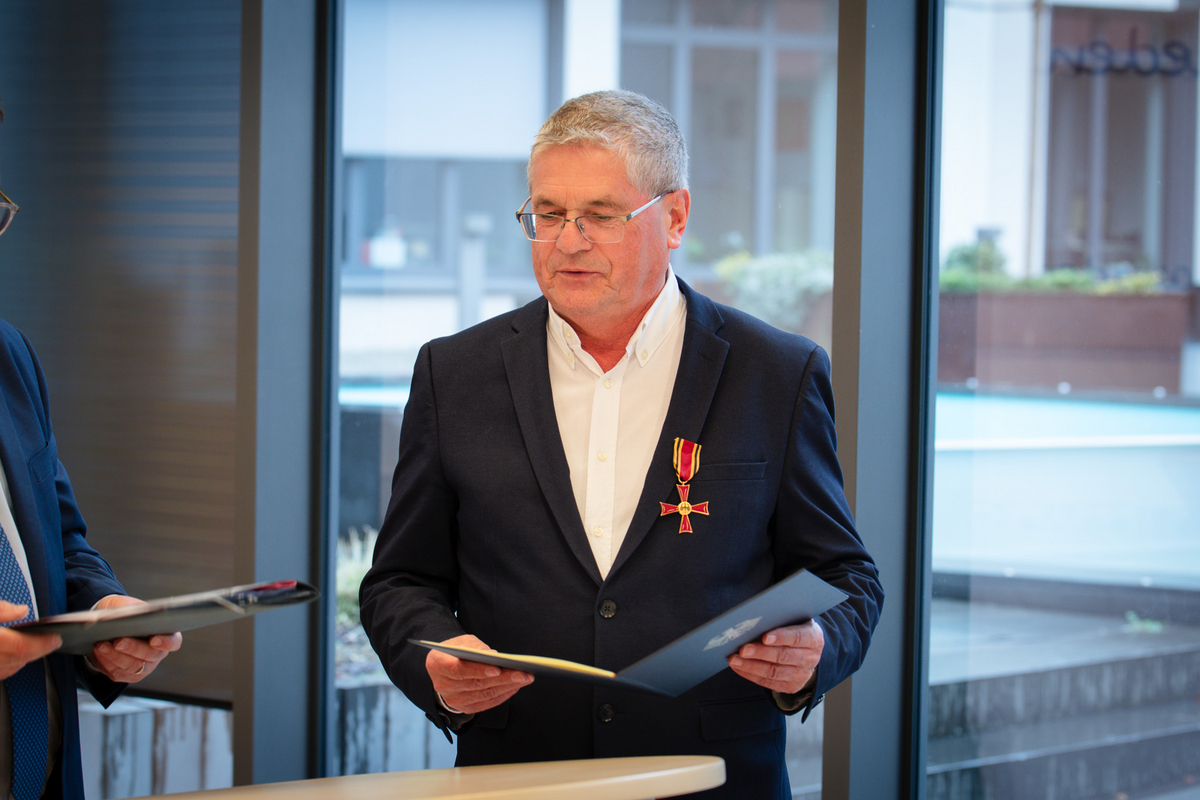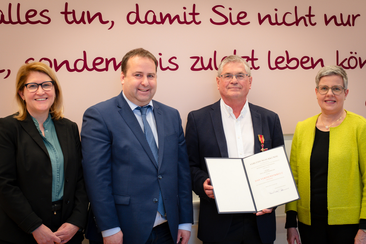 Wir gratulieren dem ehemaligen Geschäftsführer Herrn Paul Herrlein herzlich zur Verleihung des Verdienstkreuzes am Bande der Bundesrepublik Deutschland. Der saarländische Sozialminister Magnus Jung überreichte die Auszeichnung am Mittwoch, den 11. März 2026, und würdigte damit das jahrzehntelange, herausragende Engagement von Herrlein für die Hospiz- und Palliativarbeit im Saarland sowie seinen unermüdlichen Einsatz für schwerkranke Menschen und ihre Familien.
