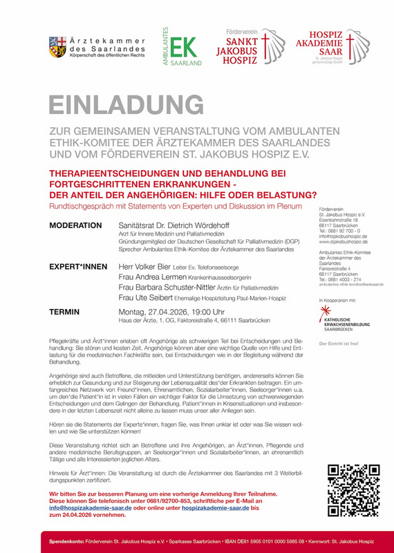 Gemeinsame Veranstaltungsreihe vom Ambulanten Ethikkomitee der Ärztekammer des Saarlandes und vom Förderverein St. Jakobus Hospiz e.V.